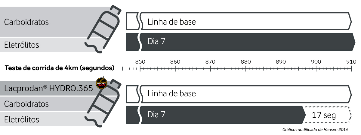 O Lacprodan® HYDRO.365 foi testado em um estudo clínico em comparação com uma formulação tradicional de bebida esportiva1. Os grupos de teste eram atletas de resistência de elite e, depois de uma semana, os resultados indicaram que o grupo que consumiu bebida esportiva e Lacprodan® HYDRO.365 apresentou uma melhora de 17 segundos em uma corrida de 4 km, mas o outro grupo que consumiu apenas bebida esportiva não apresentou nenhuma mudança.